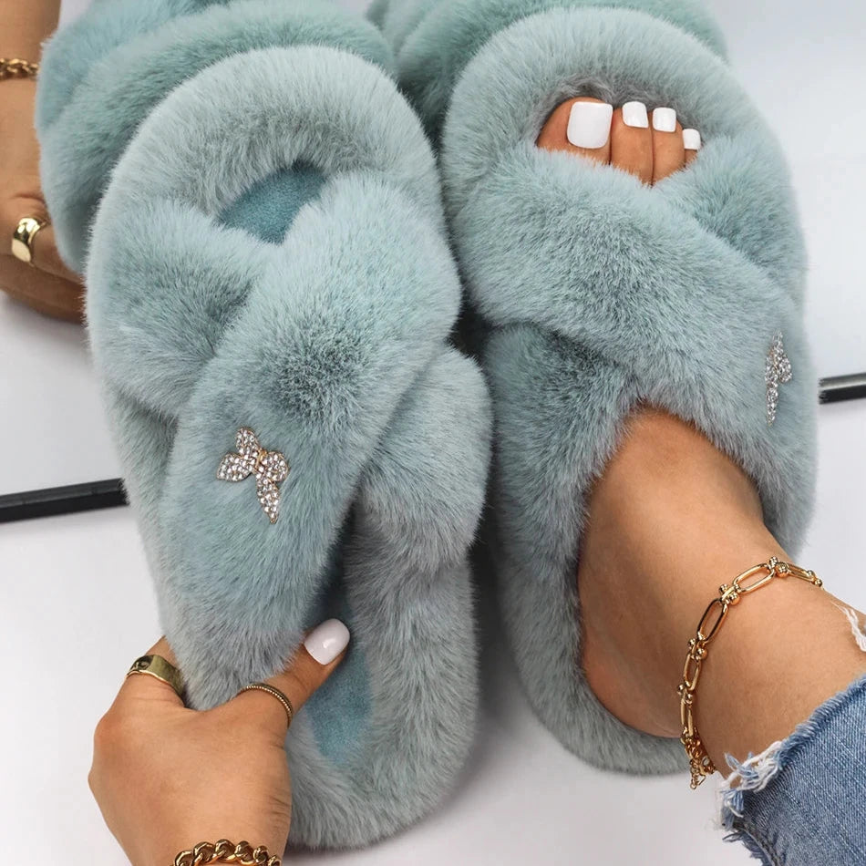 Introducing the Cozy Furry Butterfly Slippers, your stylish solution to chilly mornings. Crafted with faux rabbit fur, these slippers provide unmatched comfort and warmth. The non-slip rubber soles ensure safety and durability, making them perfect for both indoor and outdoor use. The butterfly rhinestone design adds a touch of elegance and fashion, letting you lounge in style. These slippers are available in vibrant colors to suit any taste. Elevate your home fashion game effortlessly. Experience the fusion of style and comfort today.