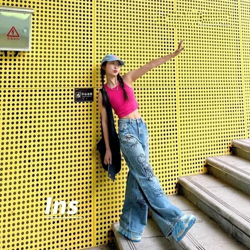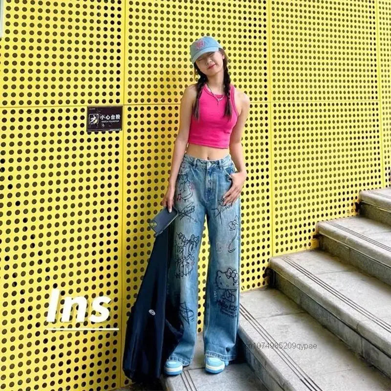 These Hello Kitty Graffiti Jeans are designed to make you stand out. Featuring a unique American retro style with playful Hello Kitty graphics, these jeans provide a perfect blend of comfort and fashion. They are tailored to fit loosely, ensuring you stay cool and comfortable during the summer.